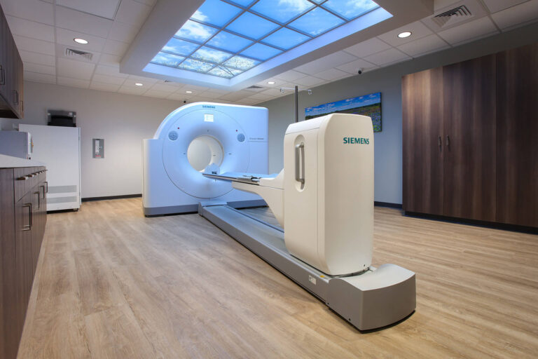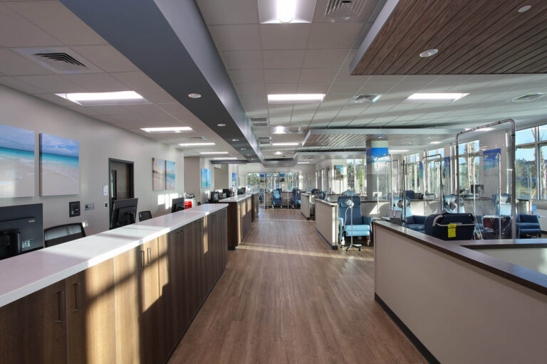 The Estero Cancer Center houses 12 exam rooms, PET/CT, lab, provides patients with access to enhanced clinical trials, and an infusion center with 36 chemotherapy chairs, complimented with slated wood ceiling treatments for a calming aesthetic.