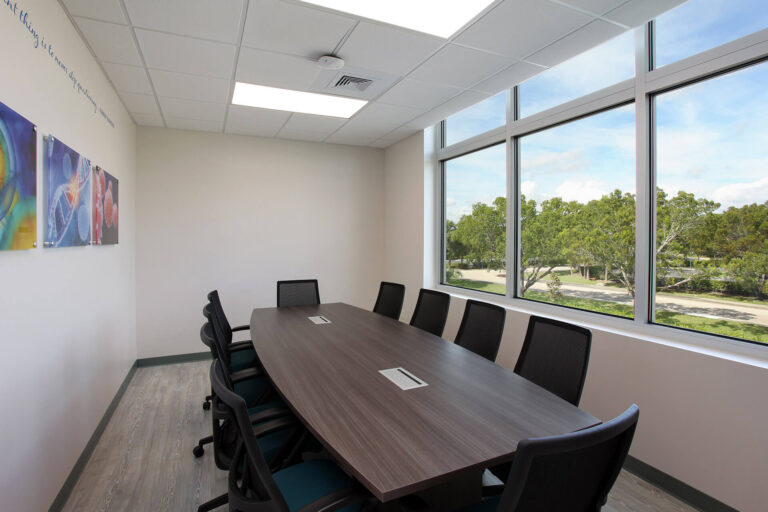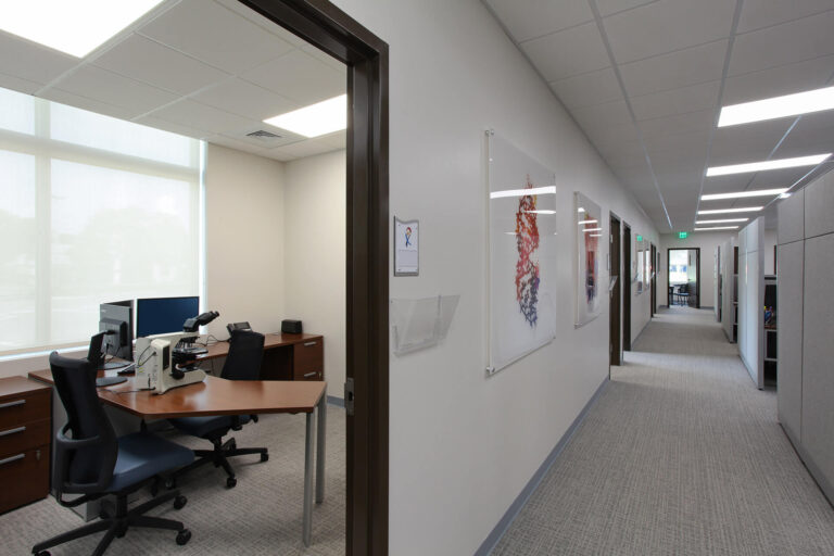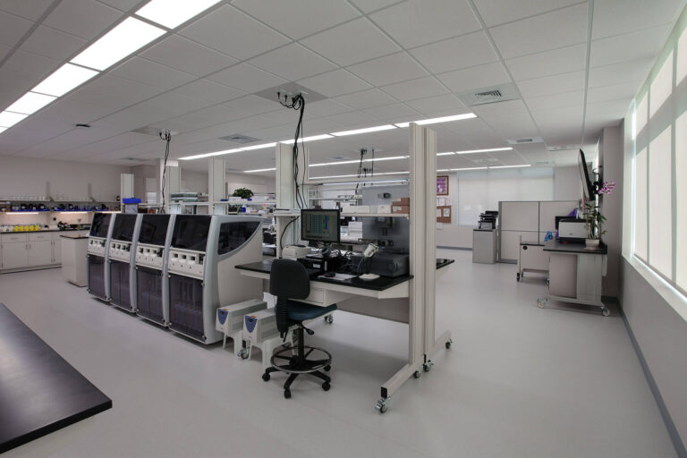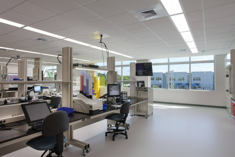 The new facility is equipped with updated technologies such as digital screens and focus boards for metric testing, LED lighting throughout the entire building, a ductless VRF HVAC system, and a full building generator. This healthcare development project was specifically a high-cost facility due to the uniqueness of the lab.